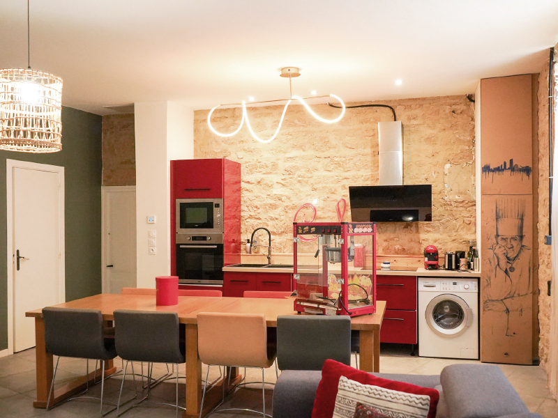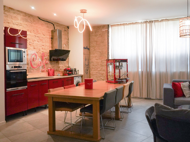 Avec son accès direct à la terrasse, sa grande cuisine ouverte aux accents vintage, ses murs en pierre et sa décoration pleine de caractère, c’est un lieu qui invite à la détente et au partage.